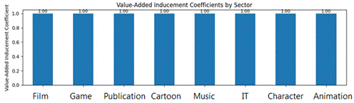 The analysis revealed that all sectors exhibit a value-added inducement coefficient of approximately 1.0. This analysis suggests that for every 1 unit increase in final demand in any given sector, the overall economy generates 1 unit of value added, consistent with the theoretical accounting balance of the Leontief input-output model. The analysis revealed that all sectors exhibit a value-added inducement coefficient of approximately 1.0. However, the intermediate calculation of value-added coefficients showed unusual negative values for most sectors (e.g., publication: -2.99, cartoon: -19.69), which warrants further investigation. In a standard economic interpretation, these coefficients should typically be between 0 and 1, representing the proportion of output that is value-added. Despite the negative value-added coefficients, the subsequent calculation of value-added inducement coefficients showed a remarkably uniform result, with all sectors having a coefficient of approximately 1.0. The bar chart visualization clearly depicted that all sectors contributed to a value-added inducement coefficient of 1.0, showing a flat graph across all sectors (Figure 4).