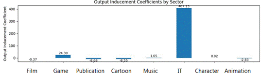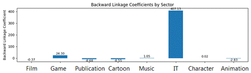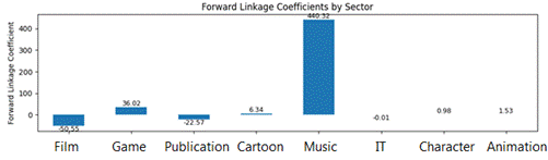 Other sectors with notable positive forward linkage effects include ‘Game’ industry (approx. 36.02), ‘Cartoon’ (approx. 6.34), ‘Character’ (approx. 0.98), and ‘Animation’ (approx. 1.53). Negative forward linkage coefficients were observed for ‘Film’, ‘Publication’, and ‘IT’’. These negative values suggest that increased production in these sectors might inhibit other sectors’ output or that their output is primarily for final consumption rather than intermediate inputs.