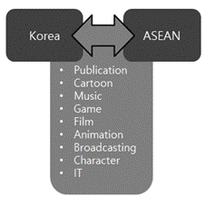 Based on this, this paper has selected the core areas of cultural cooperation between Korea and ASEAN, including publication, cartoon, music, game, film, animation, broadcasting, character, IT industries (Figure 1).