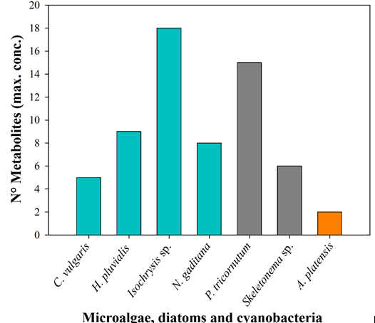 The results of this study provide detailed information on the biochemical composition and properties of different species of microalgae, diatoms, and cyanobacteria. The metabolite analysis revealed a remarkable biochemical diversity among species. P. tricornutum and Skeletonema sp. stood out for having the highest number of detected bioactive compounds, with 93% in both (Figure 1), while Isochrysis sp. and P. tricornutum showed the highest concentrations of several key metabolites, 18 and 15 respectively (Figure 2). In particular, Isochrysis sp. exhibited the highest levels of vitamin A, vitamin C, Fe, tZ, JA, GABA, Ala, Asn, Asp, Ile, Leu, Phe, Tyr, Suc, fucose, galacturonic acid, and glucuronic acid. On the other hand, P. tricornutum was characterized by its high content of K, Ca, B, ACC, iP, SA, GA3, ABA, Cit, Lac, Tri, laminarin, alginic acid, and iduronic acid. Additionally, both species showed a higher antioxidant activity. Their differentiated biochemical profiles can be used in various applications, especially in agriculture.